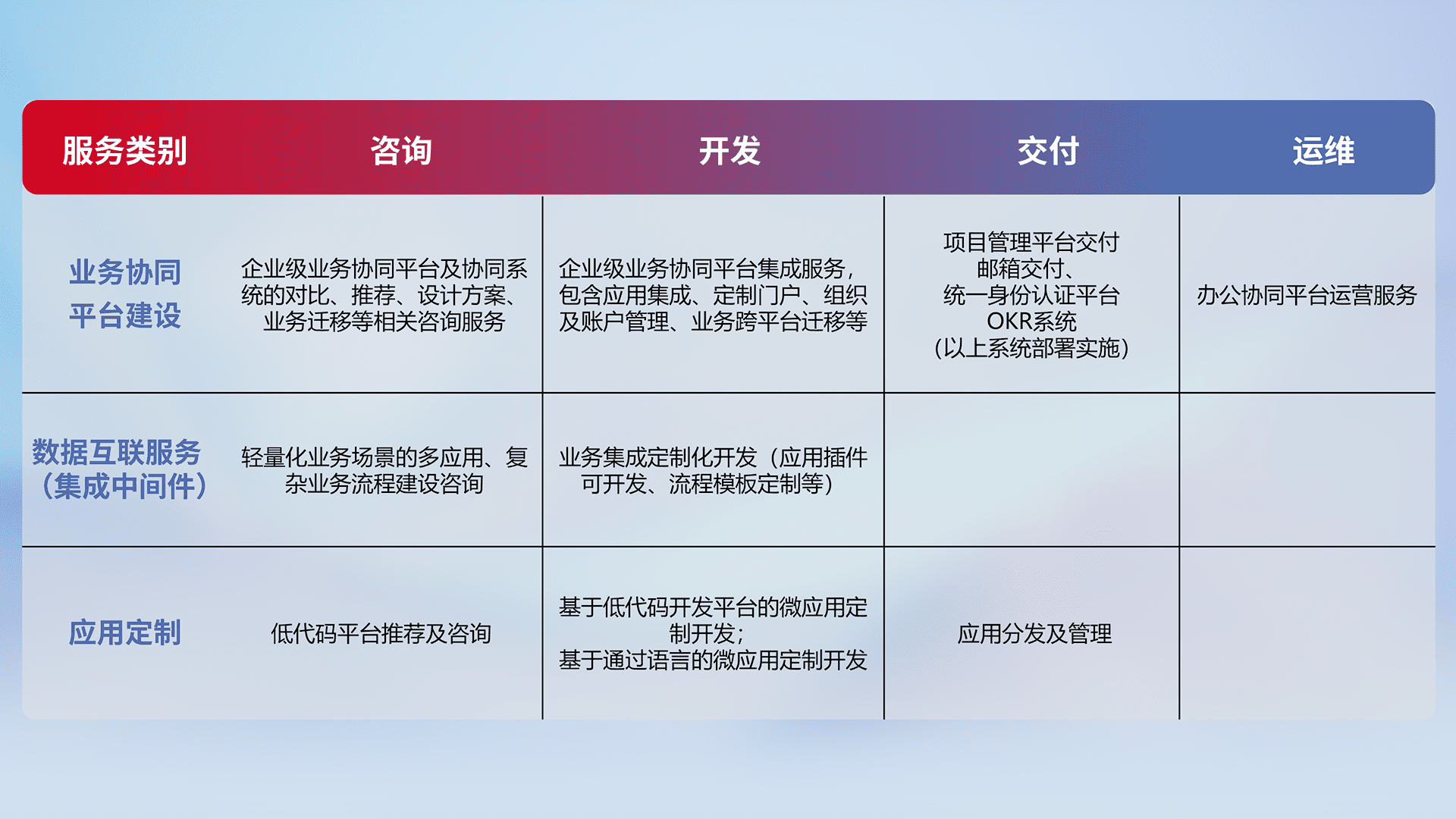 针对钉钉、、企微、、、、IDaas等平台级产品提供产品的规划、、方案、、交付、、、定制化开发等服务,,,,实现如统一协同办公、、智能客户服务、、、混合会议管理、、智能数据查询、、等业务场景,,,,实现数字化转型。。。。